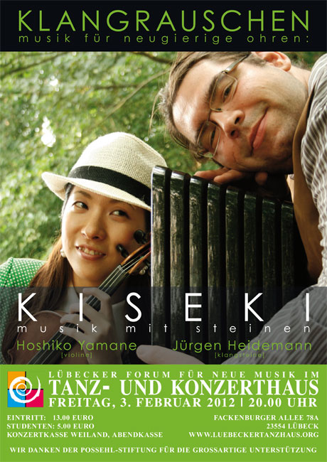 Klangsteine sind aus Vulkanitgestein. Werden die Hände mit Wasser benetzt und der Stein sanft gestrichen, entstehen erdige Basstöne oder brillante Obertöne. Treffen diese auf verträumte Melodien der Violine, so ist das der Sound von KiSeki. „ki“ jap. Holz und „seki“ jap. Stein bilden in der japanischen Sprache das Wort Wunder „KiSeki“. Diesem Wunder begegnen der Berliner Klangsteinmusiker Jürgen Heidemann und Hoshiko Yamane (Violine) in ihrer Performance. Sie lassen teilhaben an einem unmittelbaren Musikerleben zwischen fühlen, hören und nachspüren