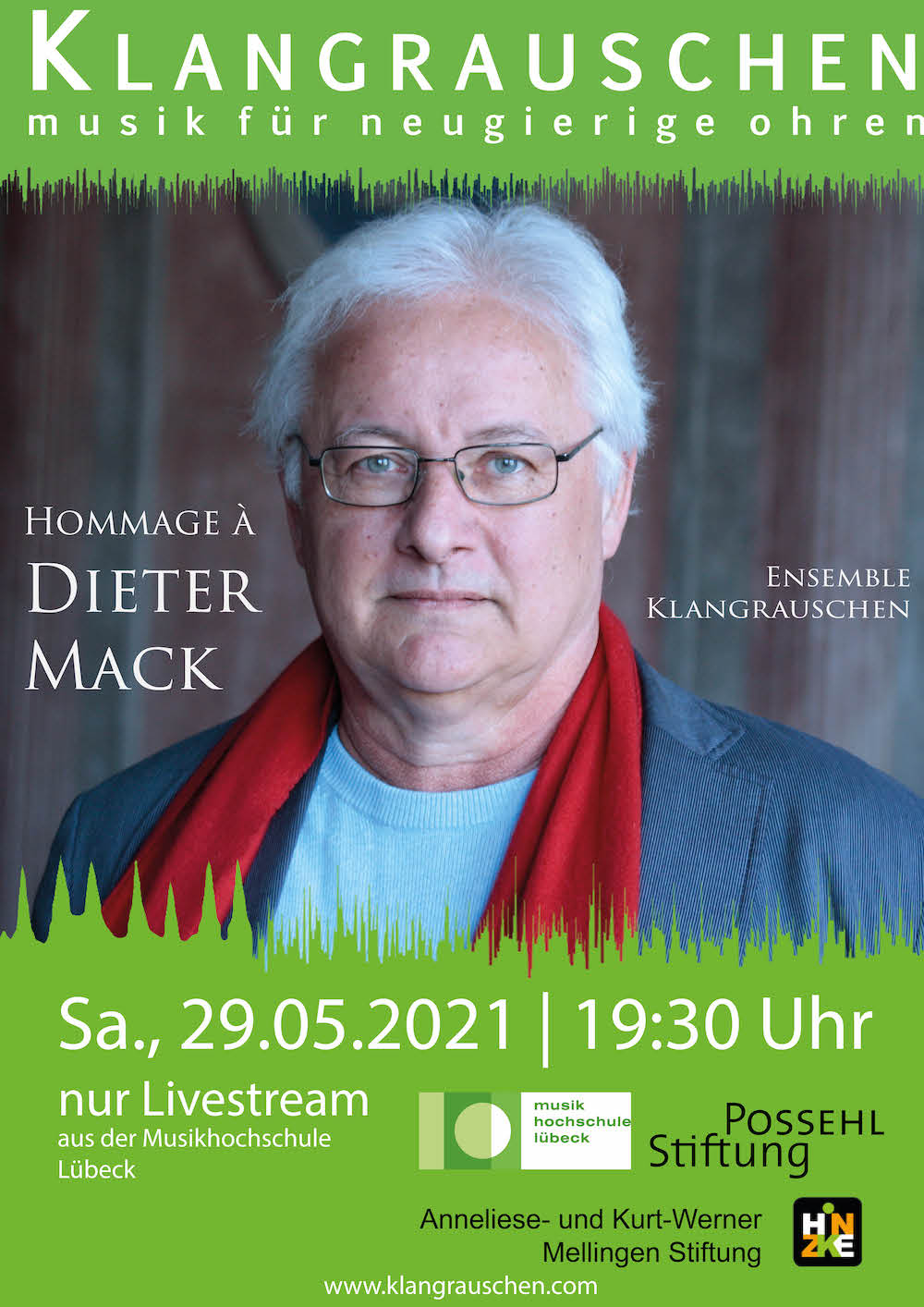 Zum Abschied ist ein Bye-Bye üblich. Klangrauschen und die Musikhochschule Lübeck möchten Dieter Mack als zentrale Figur im Bereich der Neuen Musik im Norden daher mit einem Konzert-Livestream ehren. Mack hat als Professor für Komposition an der MHL über Jahrzehnte das kompositorische Leben und die kompositorische Lehre in Schleswig-Holstein geprägt. Im März 2021 ist er in Pension gegangen und in den Süden zurückgekehrt. Auf dem Programm stehen vor allem Werke von Dieter Mack selbst, aber auch zwei neue Stücke, die von seinen Studierenden Kaspar Querfurth und Benjamin Janisch eigens für das Porträtkonzert komponiert wurden. Höhepunkt des Abends wird die Uraufführung eines neuen Quartetts für Flöte, Viola, Kontrabass und Klavier, welches Dieter Mack den Musikern des Ensemble Klangrauschen auf den Leib geschrieben hat.