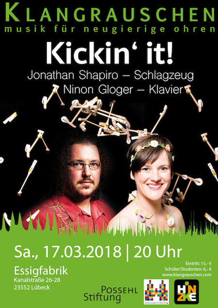 Seit 2008 sind Jonathan Shapiro (Schlagzeug) und Ninon Gloger (Klavier) ein eingespieltes Duo. Im Programm „Kickin’ it“ verschmelzen die Instrumente beider Musiker zu einem gemeinsamen neuartigen Klangkörper voller einzigartiger Klangfarben. Dabei bricht sich in den Werken des Abends eine urgründige Energie Bahn, die verschiedenste Gesichter zeigt: bei John Cages „Credo in Us“ von 1942, laut Cage eine Suite mit satirischem Charakter, erscheint sie gänzlich unverfälscht und ursprünglich. Das Stück für Klavier, zwei Perkussionisten und Radio-Spieler (Olaf Koep, Perkussion und Jakob Brandt erweitern hier das Duo zum Quartett) wurde ursprünglich für eine Tanzperformance von Merce Cunningham und Jean Erdmann komponiert und ist das erste Stück, bei dem Cage Musik anderer Komponisten aus einer Schallquelle einfließen lässt. Die Schlagzeuger spielen dabei auf Blechdosen, Gongs und TomToms und auch die Pianistin wird stellenweise zur Perkussionistin. In Matthias Kauls Werk „Do nothing, just wait, sooner or later the singing will start“ wird die Spannung ins zeitlich Unbegrenzte ausgedehnt. Auf Schlagzeugbecken werden mit elektrischen Zahnbürsten verschiedene Obertöne erzeugt, so dass ein mehrstimmiger „Gesang“ entstehen kann. Auch in der unterhaltsamen Komposition „Sxueak“ des in Alaska geborenen Komponisten Matthew Burtner werden mit verschiedenen „Quietsch-Spielzeugen“ ungewöhnliche Klangerzeuger in den Fokus gerückt, dabei entsteht jedoch eine ganz andere Klangsphäre. Bei „White eyes erased“ von Sarah Nemtsov wiederum verschmelzen die Instrumente der Musiker und Projektionen von Bildern/Fotos auf spannende Weise zu einem Gesamtkunstwerk. Die Tastatur eines Synthesizers wird dafür mit Klängen aus John Cages Klavierstücken, Samples der New Yorker Advantgarde-Band „Animal Collective“ und weiteren aufgenommenen Klavierklängen der Komponistin belegt. Da diese jedoch meistens nur sehr kurz erklingen, ergibt sich eine perkussive Spielweise, die eine neuartige Überschneidung mit dem Drumset ergibt. Die Eigenkomposition der Interpreten auf der Basis von Beatles-Songs, bei welcher der Konzertflügel ein von beiden Musikern bespielter Klangkörper wird, rundet das vielseitige Programm ab.
